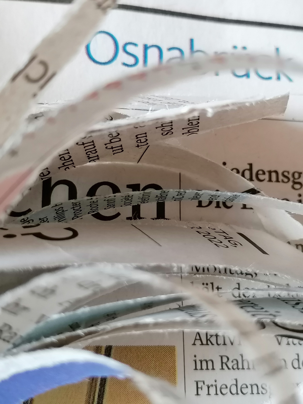 Ein weiterer Hauptbestandteil von KLEEMASCHEE ist die recycelte NOZ (Neue Osnabrücker Zeitung). Die ausgelesene Zeitung von Gestern findet hier eine tragende Rolle zum Fest oder in einem nachhaltigen, schönen Mitbringsel.